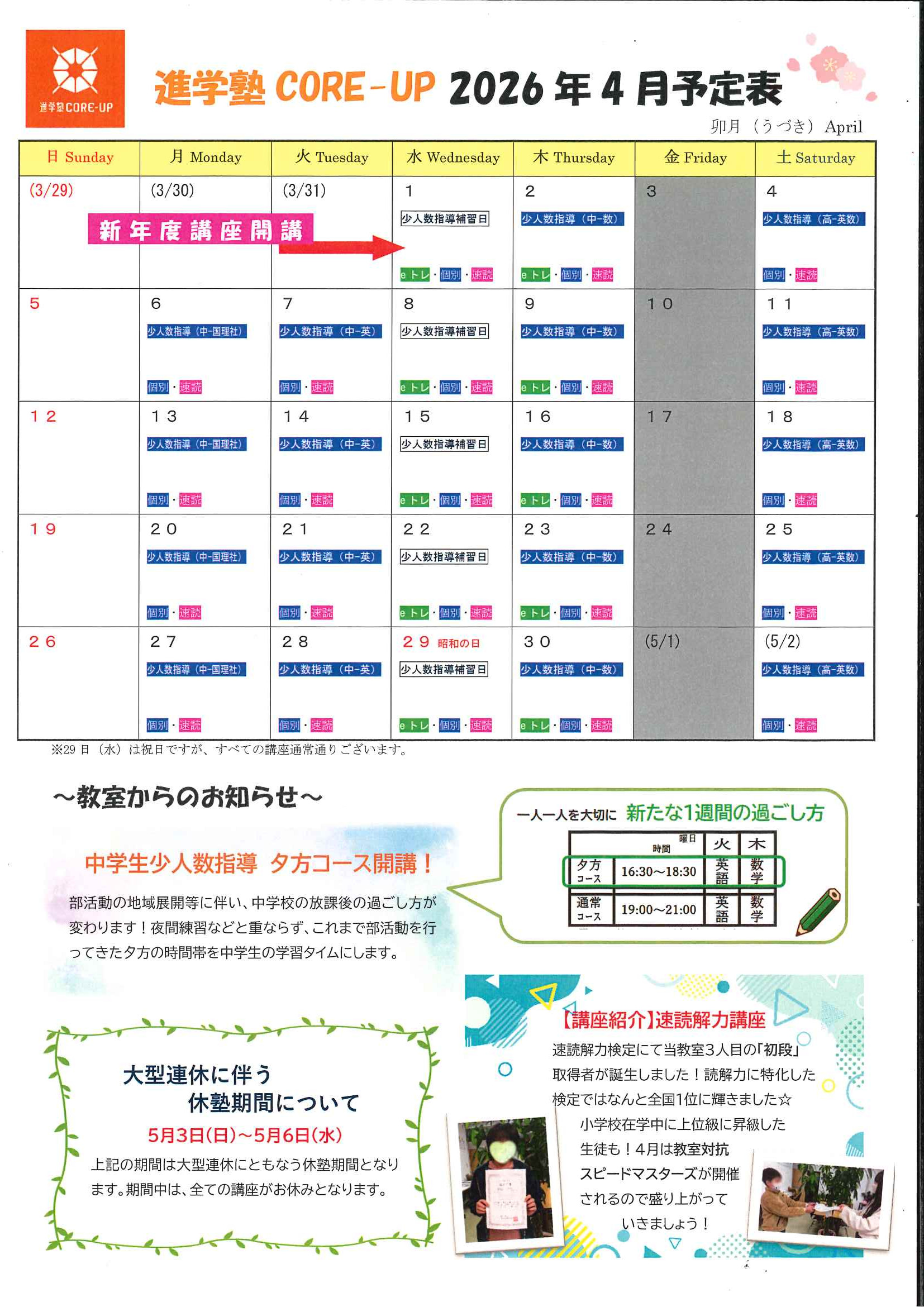 また、4月下旬から5月初旬にかけての大型連休に伴う休塾日のお知らせ、なども記載しておりますので、ぜひご確認ください!