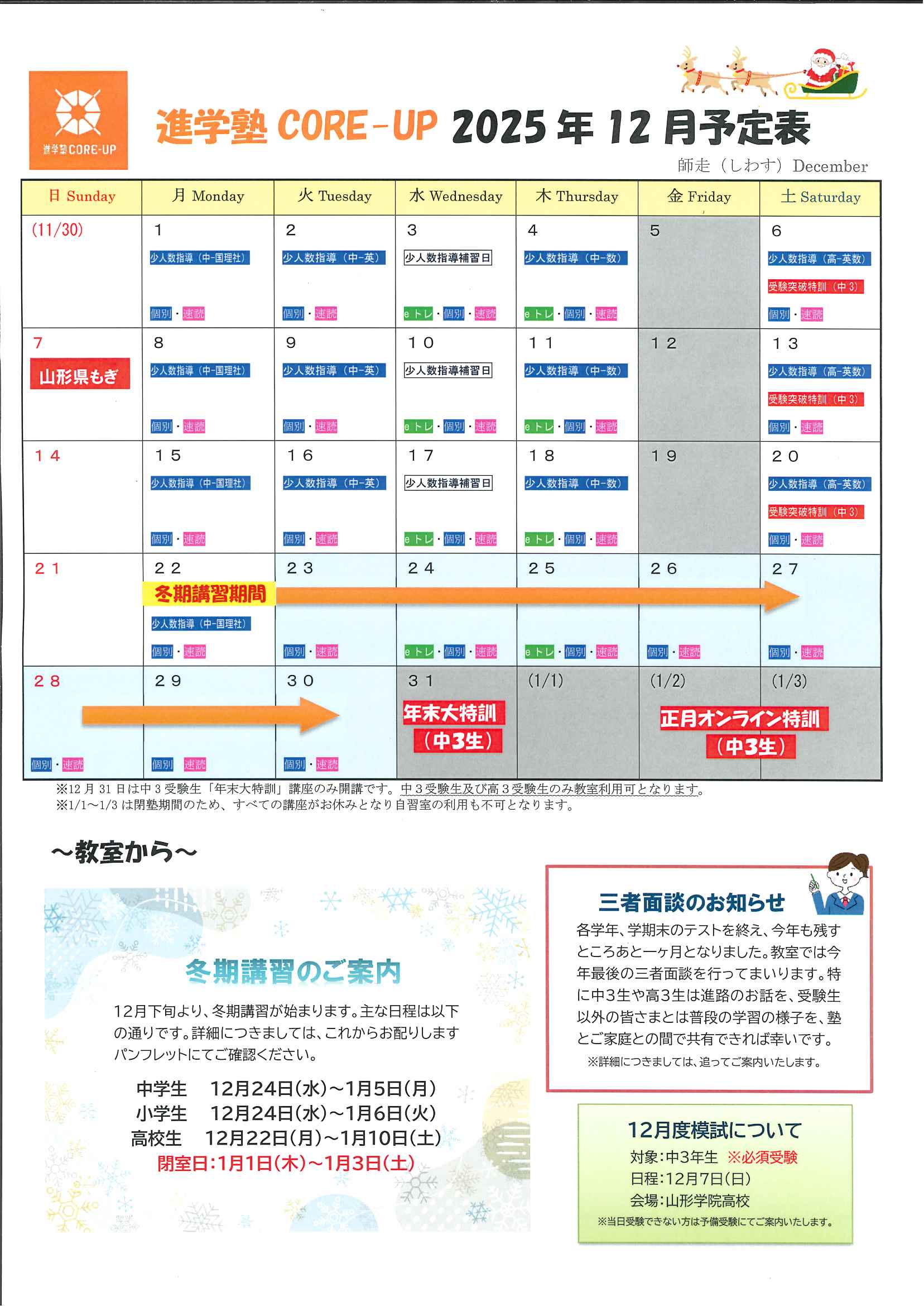 ・冬期講習(中3生は冬期入試直前特訓)の日程のご案内