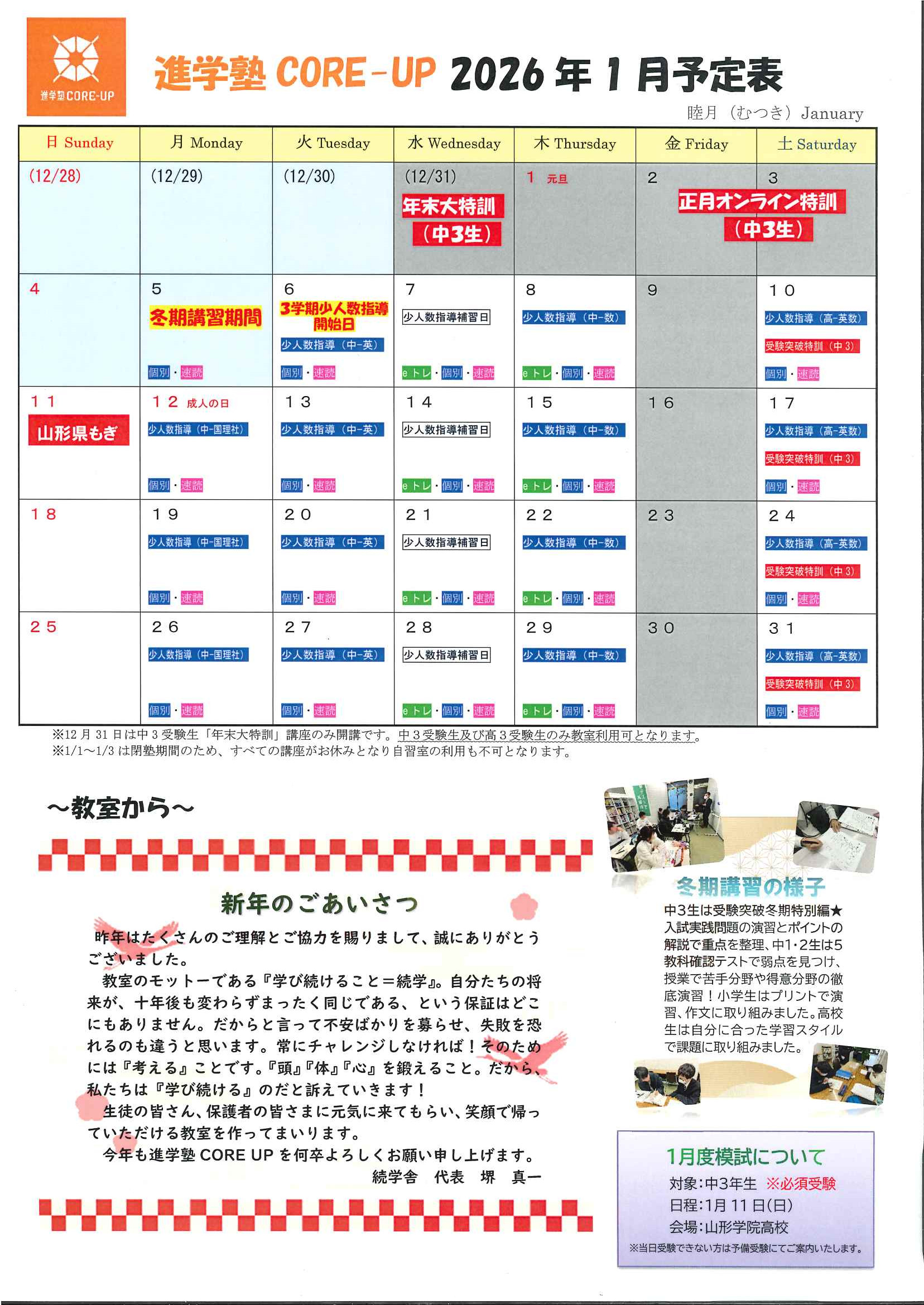 ・1月1日(木)~3日(土) 完全閉室日(※2日、3日のみ中3受験生「正月オンライン特訓」あり)